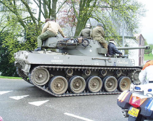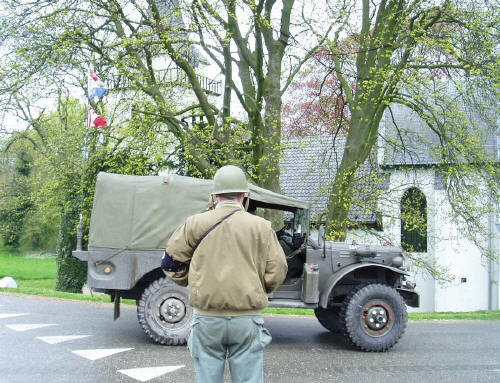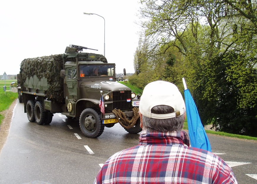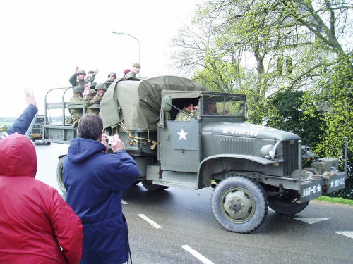 At first there arrived some MP's on Harley-Davidsons! Those motorcycles were legendary because of there heavy sound. "Liberators" became their nickname On this pic: Henkie, our boy next door! Then a Sherman tank arrived. Henkie, who is really interested in worldwar II told me it had a 4" gun. There were about 100 vehicles. This is a White half-track Jeeps Dodge Beep with sirene Wrecker tank based on a Sherman Another lighter tank Look at the foldable motorcycle on the turret ! Frist GMC 'deuce-and-a-halve' CCKW 353 is their US army discription It's written in my memory :-) I think this GMC might have a civilian cab from the '50thies. After WWII lots of GMC were converted to dump trucks or tippers. They were strong and lasted until the mid-seventies. I even know a lumberyard owner who still uses one to haul logs out of the forest! A wrecker. Maybe a Mack or a Ward de la France. It has a diesel engine! These guys were smoking large cigars like they were Winston Churchill himself! I like those GMC's. They rebuilt Europe after WWII On the background the church of Slijk Ewijk. White halftrack with anti-aircraft artillery American Jeep with Dutch flag! GMC with soldiers. This village is named Slijk Ewijk. Problaby 'Slijk Ewijk' cannot be pronounced by English speaking people, in the war it was called 'Slikky Wicky' . On the other hand 'thank you very much' was