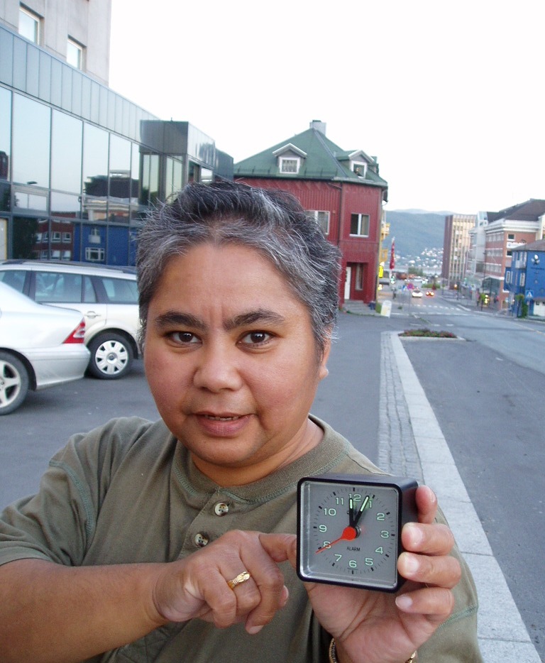 12 o'clock. PM or AM ?? This is the city of Narvik at the Norwegian westcoast. About 400 kilometres above the polar circle. The sun never sets in the summer over here - at midnight it shines.... from the north! BTW: it is midNIGHT on this pic. |