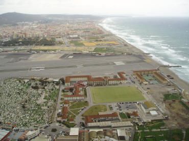 Gibraltar was wel vol! Een kerkhof, voetbalvelden en een vliegveld. Maar als er een vliegtuig wil landen of opstijgen moet het verkeer van de hoofdweg stilgezet worden. Die weg loopt namelijk dwars over het vliegveld! |