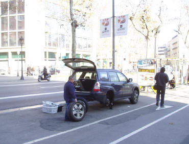 De beroving! Na 200 meter hadden we weer -nu linksachter- een lekke band! We parkeerden op de stoep bij een Audi-garage waar ik naar binnen liep om assistentie te vragen. (ik had natuurlijk maar 1 reservewiel) Het was echter 13:00 uur dus siësta tot 15:00 zei men. 'vraag eens bij Renault' maar die waren gesloten. Dus ik liep naar Honda - maar dat was alleen een showroom 'Om de hoek zit een bandenzaak, vraag daar maar eens' Ik liep terug naar Tina en ja hoor: 'Ik ben beroofd!' schreeuwde ze. Tina zat in de auto en werd aan de ene kant toegesproken door zo'n scootergast. Een andere rukte haar deur open en na een kleine worsteling pikte hij haar tasje mee. Wat nu? Ik besloot de lekke band snel even te laten plakken bij de aangegeven bandenzaak. Die kon ik echter niet vinden, wel een 4de garage. Die verwees me naar een 5de, die naar een 6de, en die naar een 7de. Toen ik daar naar binnen liep zag ik op het gezicht van de eigenaar al een teken van herkenning en dat beloofde niet veel goeds. 'Sta je op de Via Diagonal of bij de Sagrada Familia' 'Op de Via Diagonal' 'Mmm. Pas op dat je niet beroofd wordt' 'Dat is al gebeurd' En hij probeerde de band op te pompen. 'pssssss' .... en de garagist wees mij op een messteek aan de zijkant van de band. De band kon dus niet meer gerepareerd worden. Ik had de indruk dat ik niet de eerste was die dag, de man gaf aan dat dit de truuk was van de scooterboys om toeristen te laten stranden om ze te kunnen pakken. Dat was schrikken! 'pas op voor malafide afsleepbedrijven, die zijn hier maar al te veel' waarschuwde hij nog. Ik liep de deur uit, stak twee straten over en merkte dat ik -misschien wel door de driehoekige huizenblokken terzijde van de Via Diagonal - verdwaald was. Daar stond ik, met een lekke band in een vreemde stad.... de lol was er toen effe vanaf. Ik begon de weg te vragen aan mensen. 'Via diagonal por favor?' Veel mensen wisten het niet, reageerden niet of stuurden me de verkeerde kant op. Bijna werd ik toen zelf ook een slachtoffer.... Ik sprak een keurige oude heer aan en -eerlijk is eerlijk- hij wees me de goede kant op maar bleef beetje tegen mij aan kletsen over 'Hollanda' ..... Opeens kwam er een 'politieman in burger' die zijn identiteitspasje met foto liet zien: 'Police. Is this man bothering you?' 'Mooi' dacht ik. Eindelijk hulp! 'Did he offer you drugs? Narcotics? Show me your passport! Show me your wallet!' De nette burgerman gaf zijn portemonee aan 'de agent'. De 'agent' haalde het papiergeld eruit en besnuffelde het. 'Thats OK' zei hij. En toen ik. Ik had mijn portemonee al in de hand maar realiseerde me net op tijd dat papiergeld besnuffelen nou niet echt een wetenschappelijke methode was. Dus ik stopte de portemonee weer weg. 'I'm from the police' zei de agent zeer overtuigend en toonde zijn ID nog een keer. 'he is from te police' zei de burgerman. Yeah right! Ik ben gewoon weggelopen (met mijn autowiel... ik was tenslotte twee koppen groter dan die losers!) Op dat moment was de tijd voor grapjes echt voorbij. Ik verdeelde mijn pasjes en mijn geld over diverse zakken en had iemand mij op dat moment aangeraakt / onheus bejegend.... dan had ik zinvol geweld niet uitgesloten! Uiteindelijk teruggekomen bij Tina en de auto besloot ik via de ANWB om een afsleepauto te vragen. Nog even een dankwoord voor de politie van Barcelona: Ik heb de politie gebeld. Ze zouden komen maar kwamen niet. Wel reed er elk kwartier een politiewagen langs die ons -met onze buitenlandse auto met 3 wielen, geparkeerd op het fietspad in een gebied dat bekend is om zijn berovingen- wel aangaapten maar geen poot uitstaken. Uiteindelijk sprak ik twee wandelagenten aan. 'Ja, ja, dat gebeurt hier elke dag' zeiden ze schouderophalend.... Ze vonden dat ik op het buro aangifte moest gaan doen maar daar had ik dus geen zin in. Uiteindelijk zijn we zonder paspoort -hopend op geen controles- teruggereden naar Nederland. |
