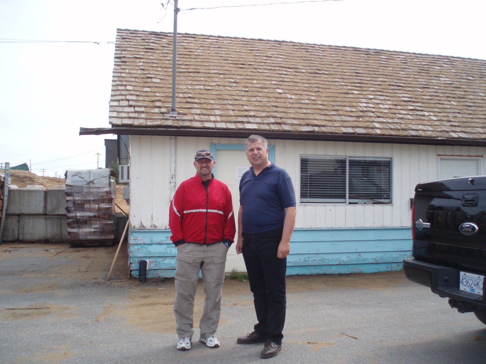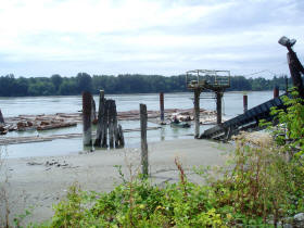 Stammen afkort zaag Deze grote circelzaag kort de stammen af op stukken van (meestal) 45 cm = shingellengte Men gebruikt uitsluitend Western Red Cedar fijnjarige 'old growth' stammen in een wat lagere kwaliteit. (klein gebrek is in tegenstelling tot de stammen voor Red Cedar planken hier wél toegestaan) De aanvoer is overigens geen probleem: door het doordachte Canadese bosbouwbeleid is er bos genoeg om verantwoord uit te kappen. |