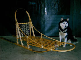 Hondenslee "De slee is nu geheel sneeuwklaar. Het gebruikte materiaal is een balk van essen hout, roestvrij stalen bouten, sisal touw en glij-ijzers van roestvrijstaal. vriendelijke groet Martin de Bruijn" |