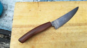 Keukenmes in lizarddamast Bob Eijsma 'Nooit gedacht dat Santos Palissander zo glashard zou zijn' schreef dhr Eijsma ons nadat hij bij ons een stukje hout voor zijn zelfgesmede mes had uitgezocht. Het resultaat is prachtig! Damastsmeden is een techniek die oorspronkelijk uit Damascus komt: door het steeds opnieuw dubbelslaan van het metaal wordt het mes sterker en je krijgt (als je het echt goed kunt) een bizar fraaie oppervlakte tekening! |